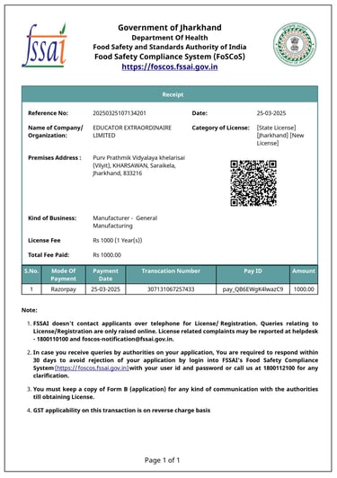 An application for the FSSAI (Food Safety and Standards Authority of India) licence has been officially submitted. This licence is mandatory for food-based businesses, ensuring that the turmeric processing unit meets food safety regulations.