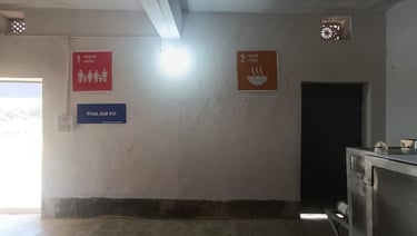 Several informative posters have been placed across the processing unit to reinforce important guidelines and branding efforts. These posters display: