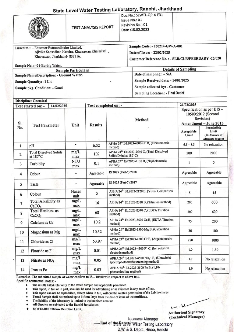The water testing report for the turmeric processing unit has been received, confirming that the water quality meets the required safety and hygiene standards essential for food processing.